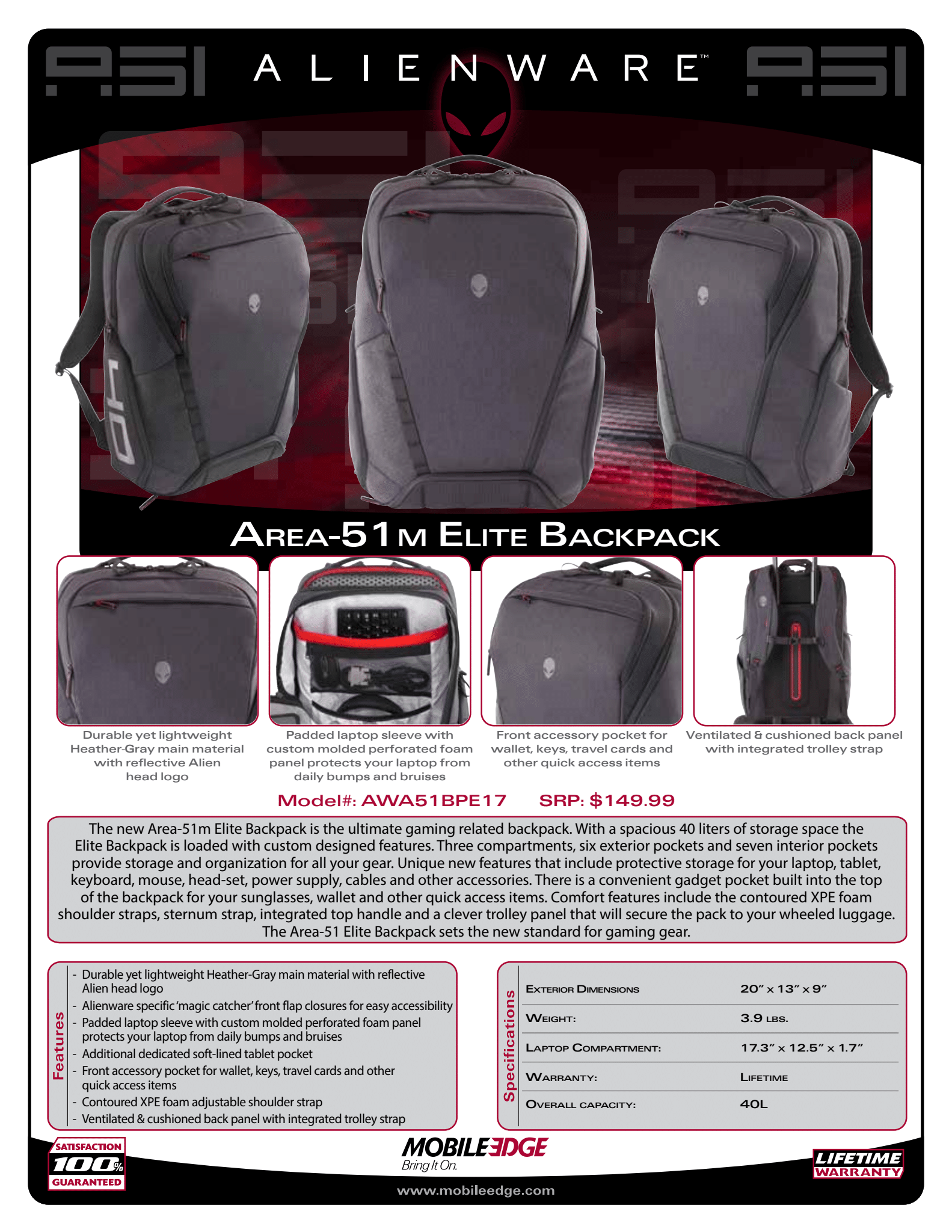 The new Area-51m Elite Backpack is the ultimate gaming related backpack. With a spacious 40 liters of storage space the Elite Backpack is loaded with custom designed features. The Area-51 Elite Backpack sets the new standard for gaming gear.